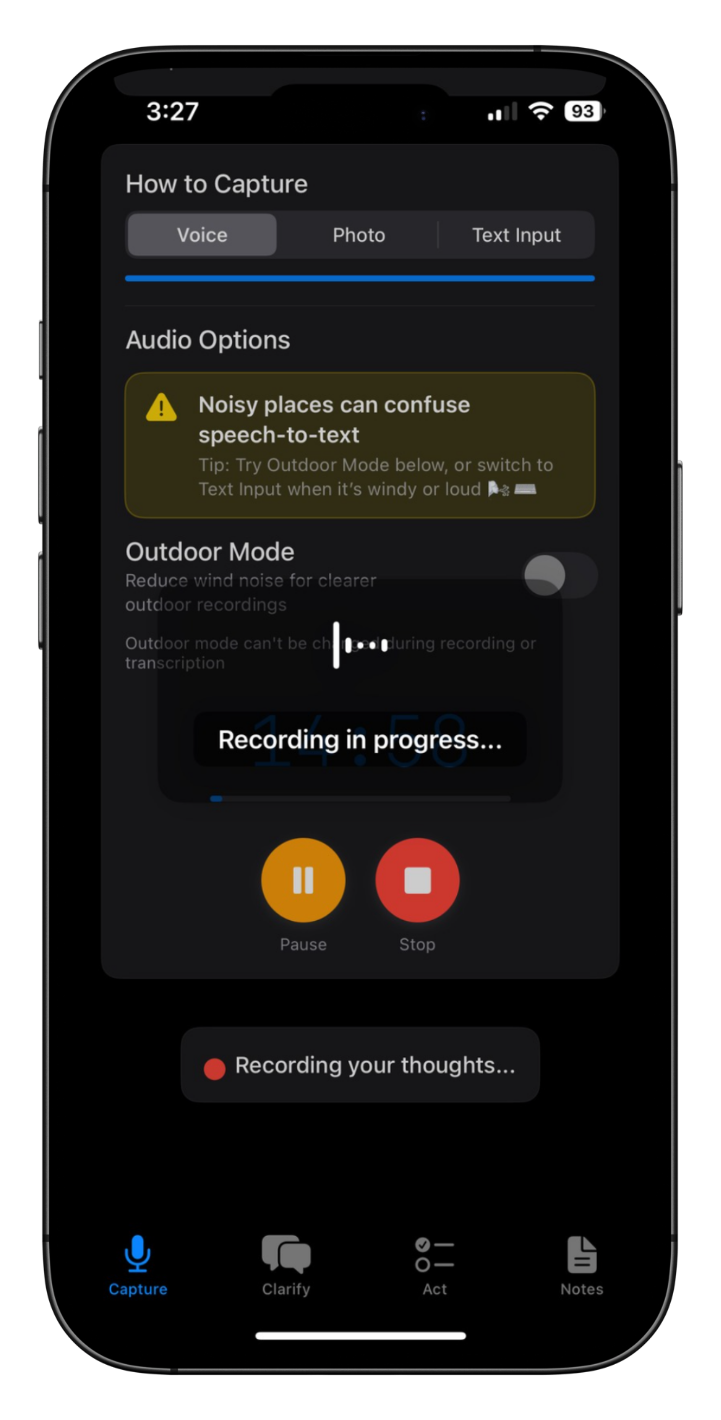 Capture ideas while walking with wind-noise reduction. If transcription stumbles, retry on the same audio without re-recording