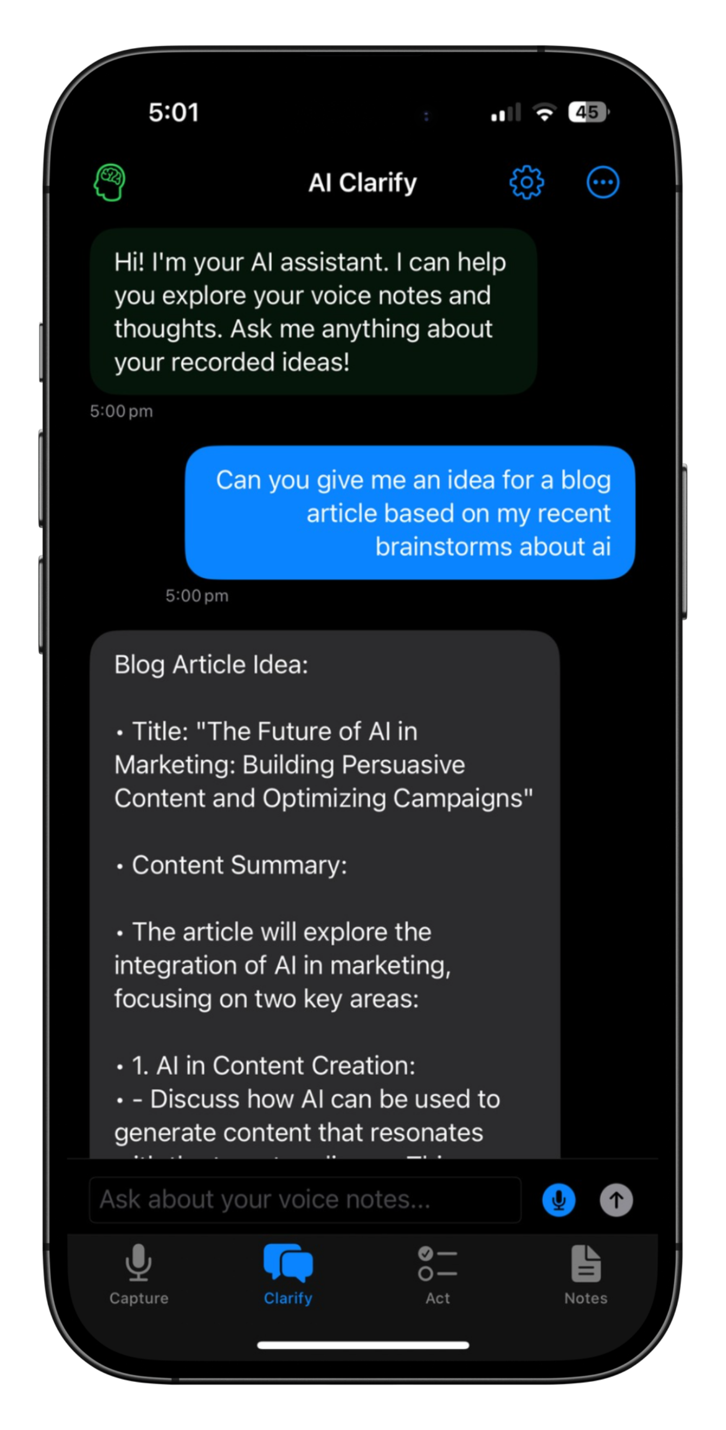 Capture investor feedback, customer insights, and product ideas on the go. When it's time to execute, ask your AI what you said about pricing, features, or strategy with citations from your actual conversations.