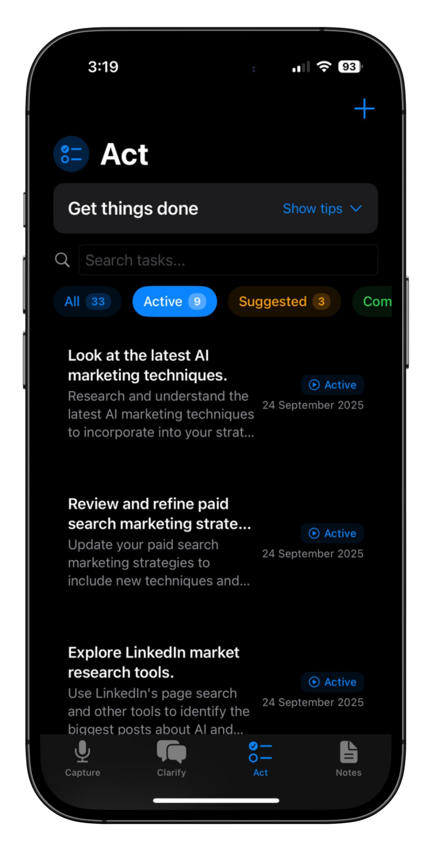 After capturing a brain dump, F0cusly suggests tasks. Save only what you want.