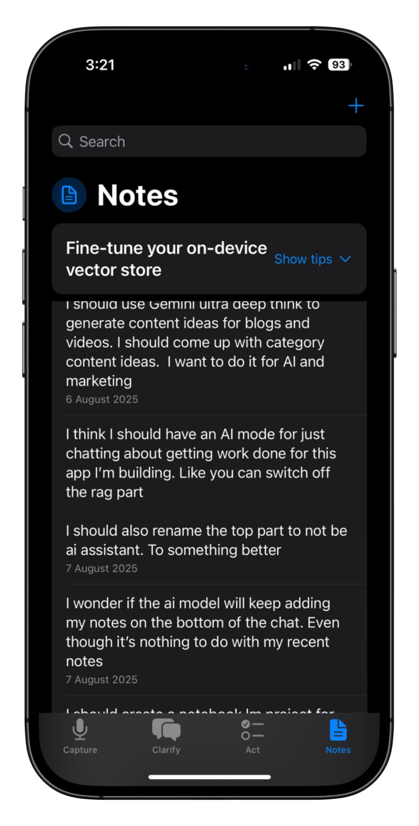 An ADHD-friendly AI that captures your thoughts instantly, searches them with citations, and turns them into action—all on your device. No subscriptions. No cloud. No forgetting.