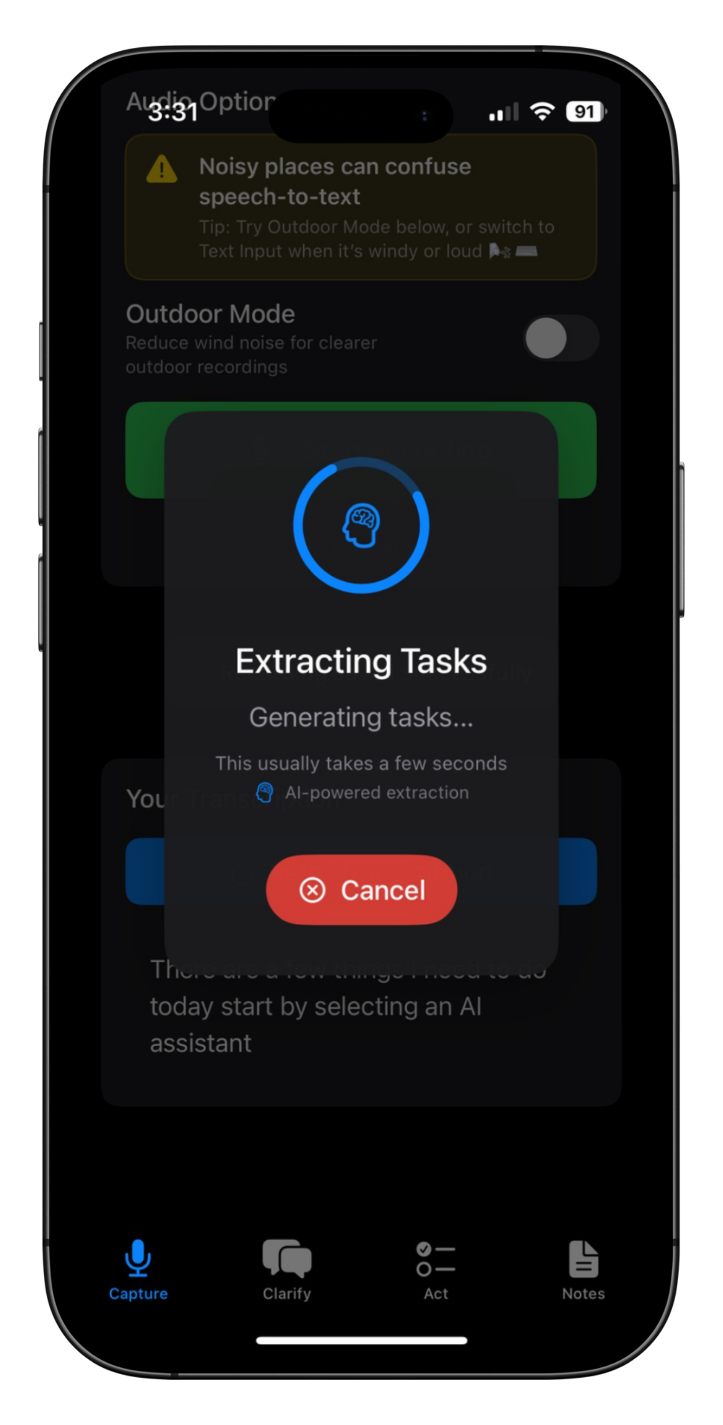 Capture ideas while walking with wind-noise reduction. If transcription stumbles, retry on the same audio without re-recording