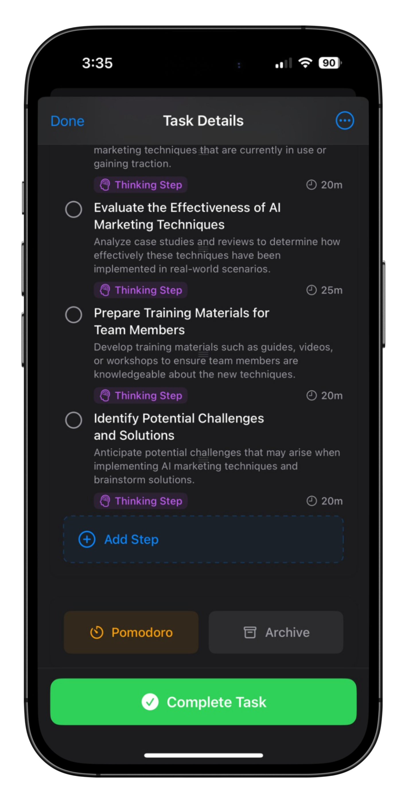 Start a Pomodoro session on your next micro-step. Work in focused bursts. Mark progress. The app handles timing and notifications so you can focus on the work, not the clock.
